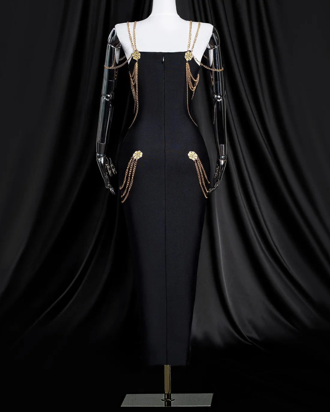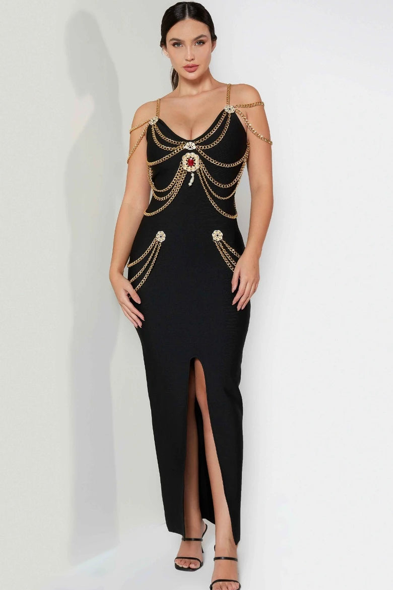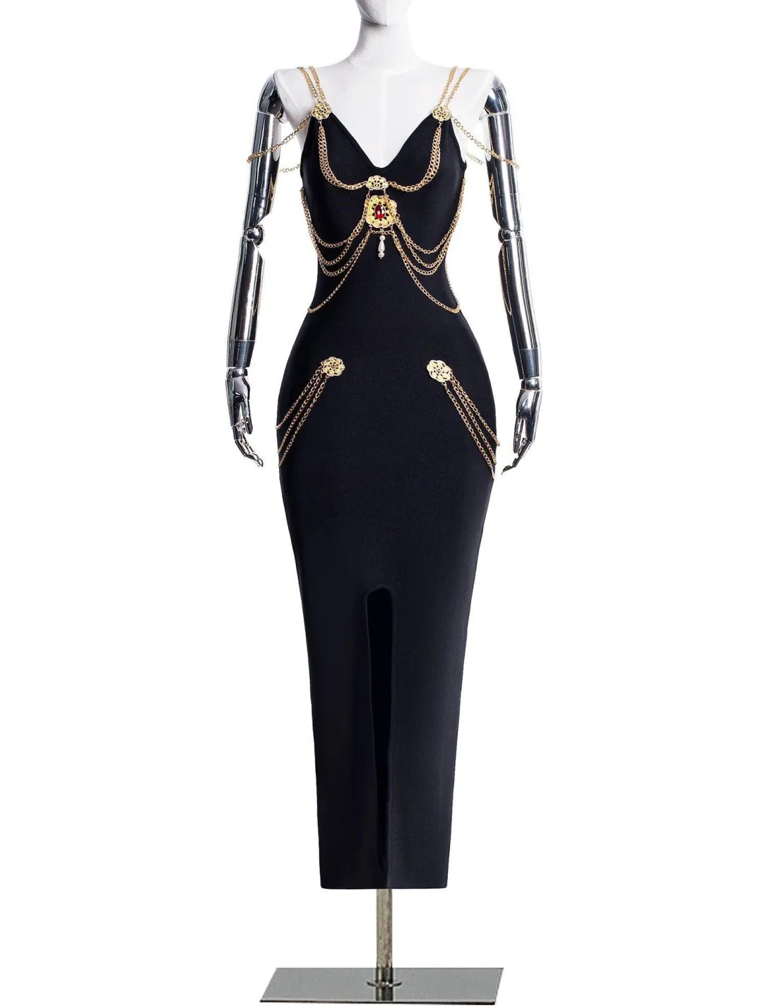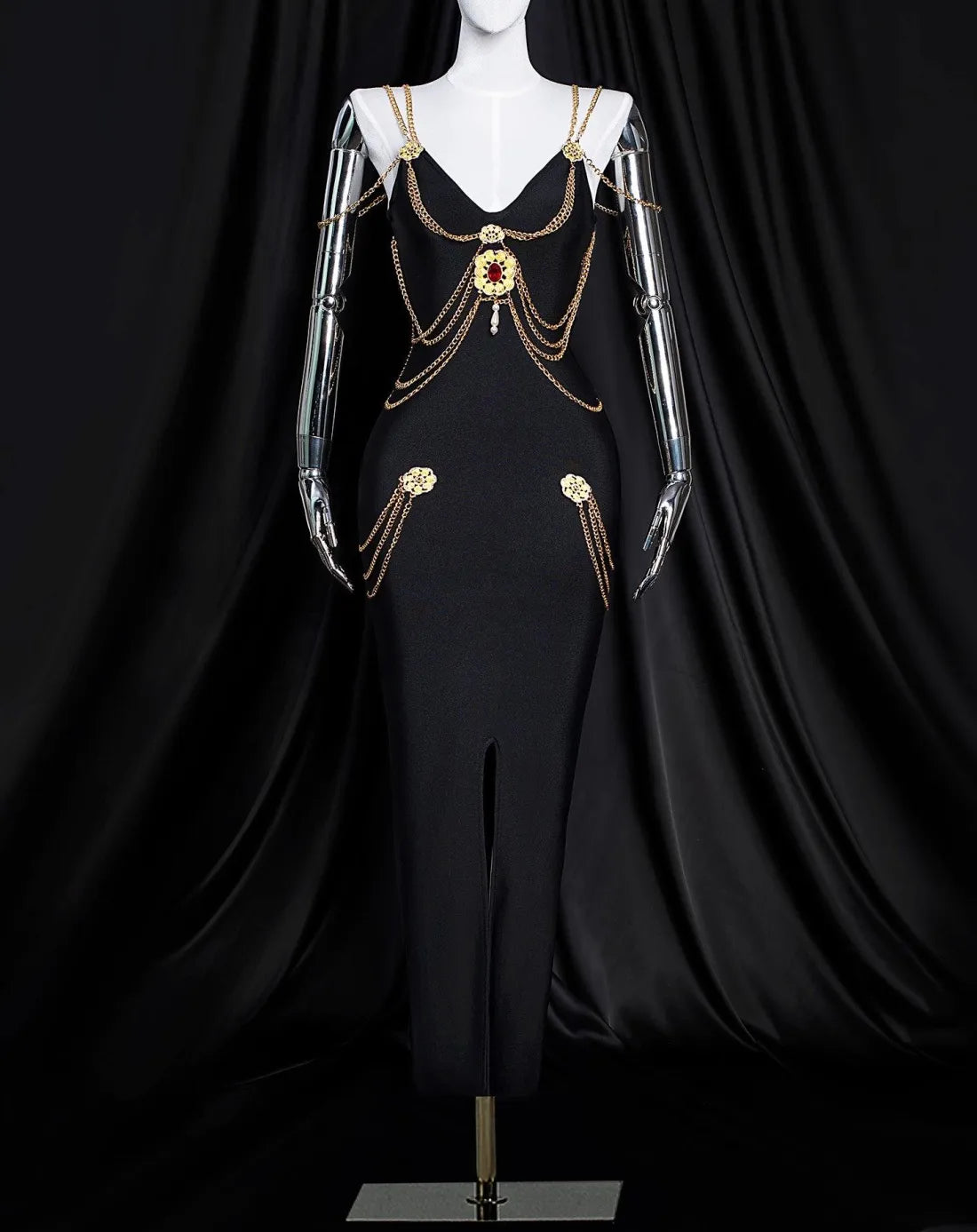 Metal süsleme detayları bu mükemmel siyah elbiseye canlılık katıyor. Bu elbise, inanılmaz bandaj kumaşımızdan üretilmiştir ve metal süsleme detaylarına sahiptir. Akıllıca şekillendirilmiş yapısı kıvrımlar yaratırken, maksi etek ucu görünümü dengelemek için mükemmeldir.