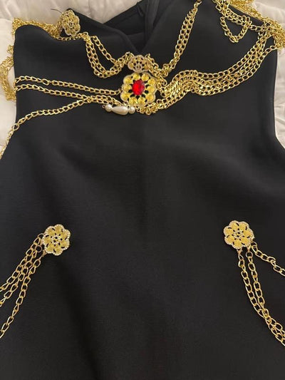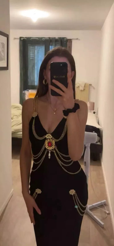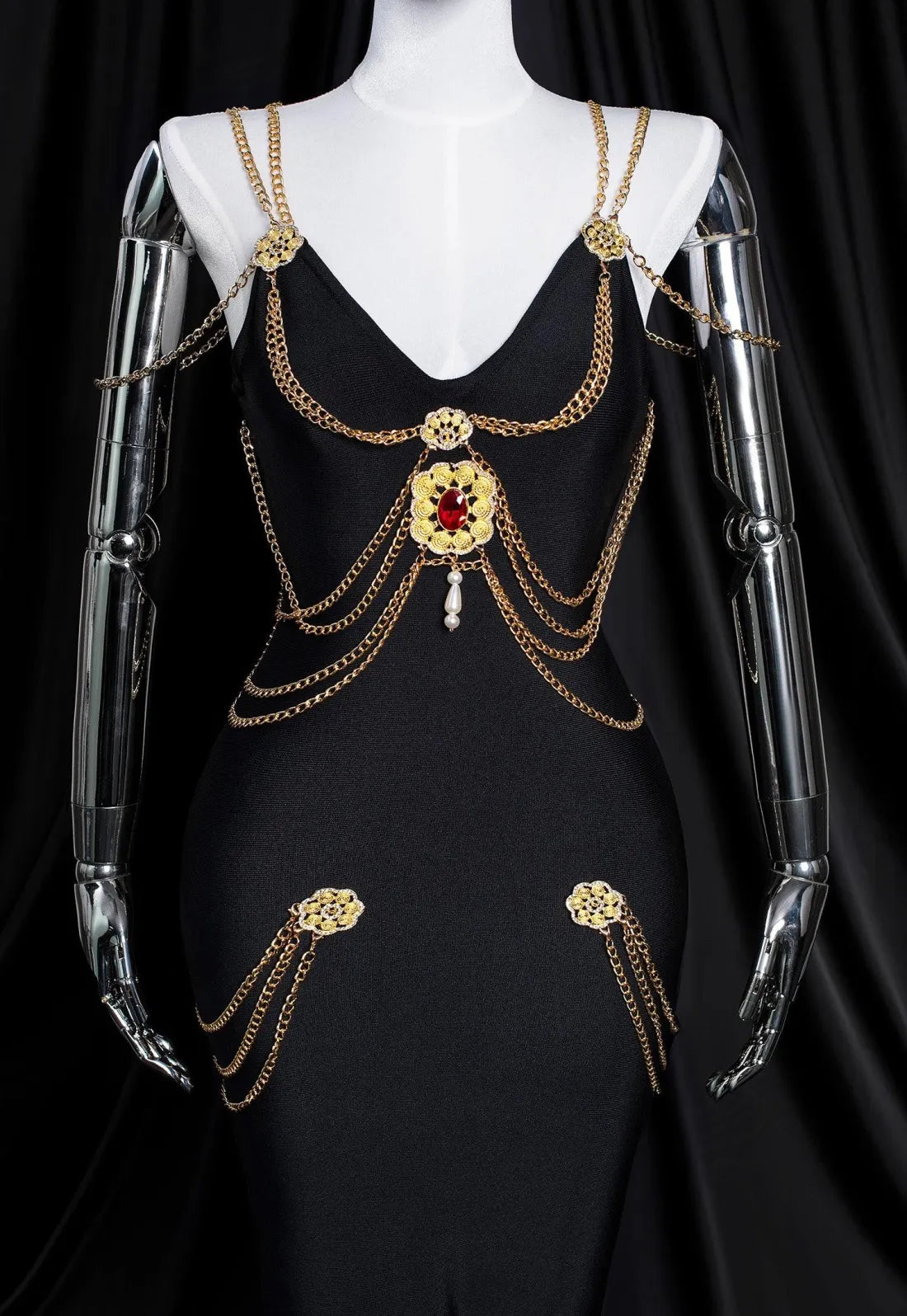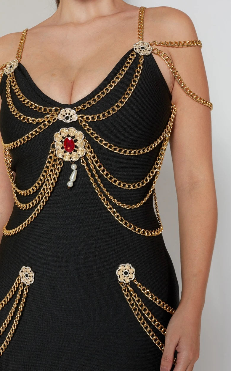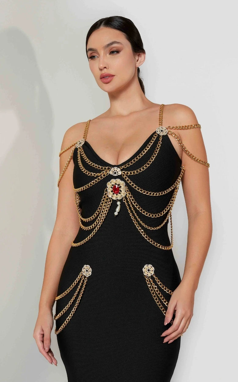 Metal süsleme detayları bu mükemmel siyah elbiseye canlılık katıyor. Bu elbise, inanılmaz bandaj kumaşımızdan üretilmiştir ve metal süsleme detaylarına sahiptir. Akıllıca şekillendirilmiş yapısı kıvrımlar yaratırken, maksi etek ucu görünümü dengelemek için mükemmeldir.