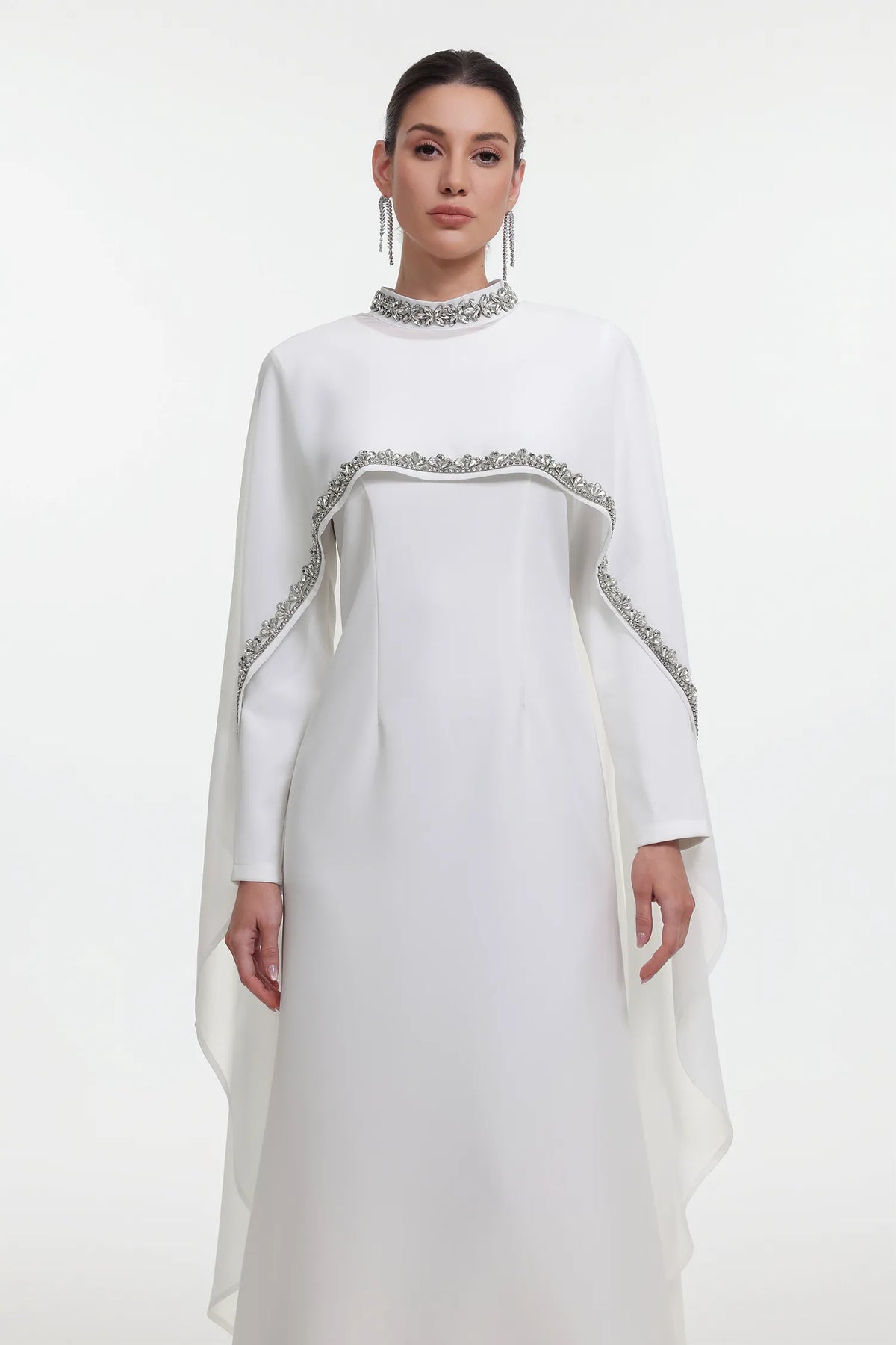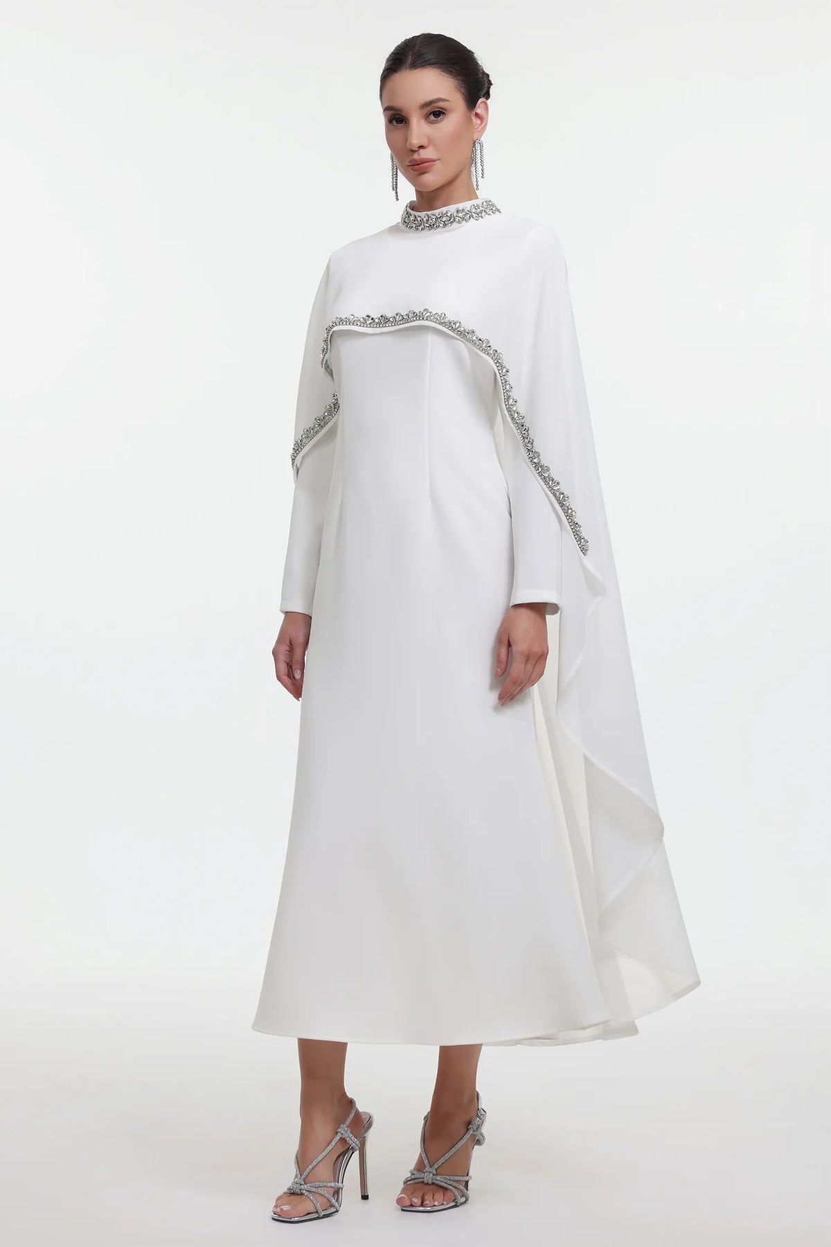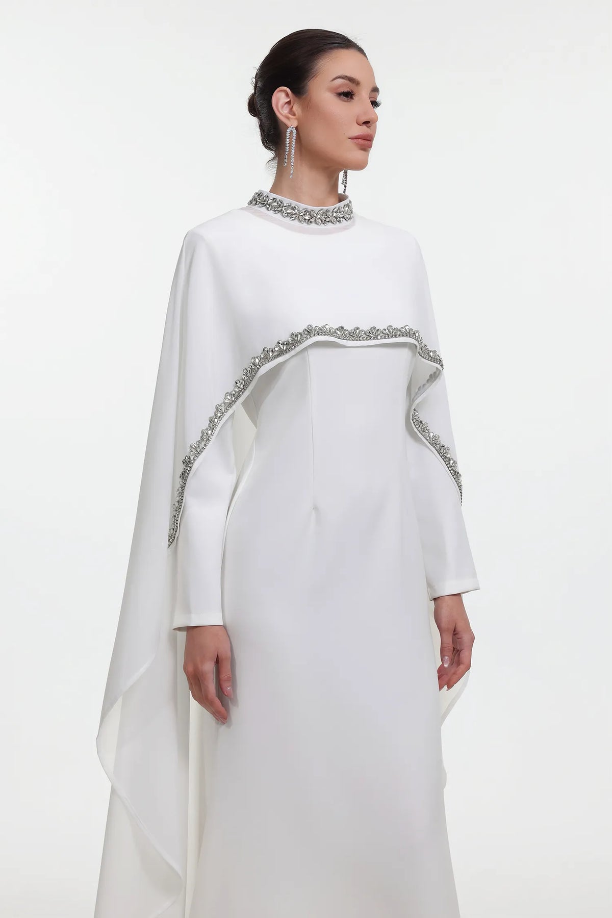 Özel Dikim Taşlı Pelerinli Maksi Elbise
