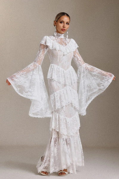 Malvina Volanlı Dantel Uzun Elbise