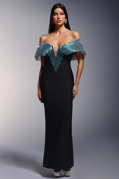 Dorie Derin V Yaka Bandaj Omuz Açık İnci Uzun Elbise