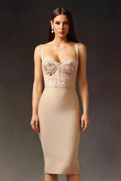 Euran Kolsuz Çiçekli Bandaj Midi Elbise
