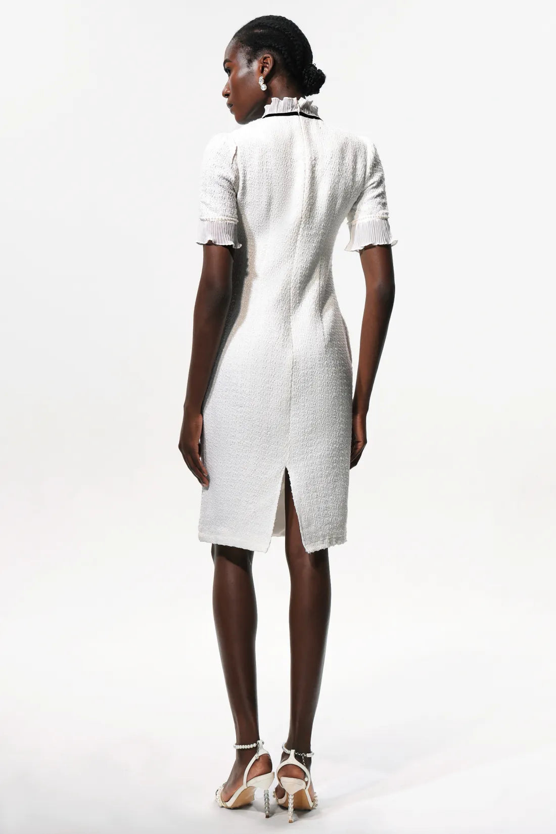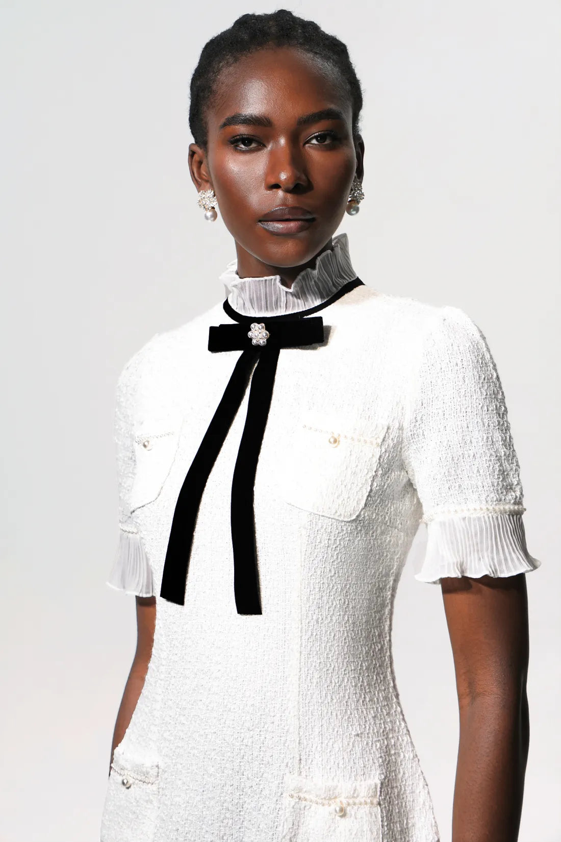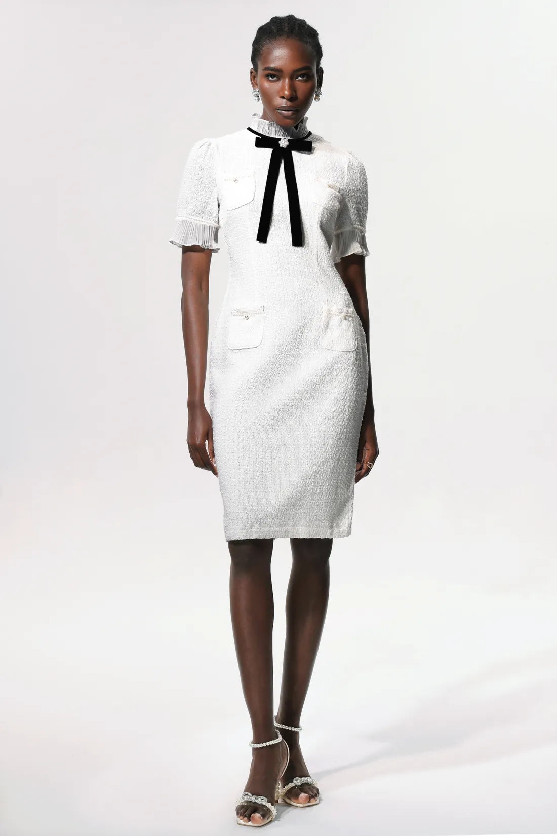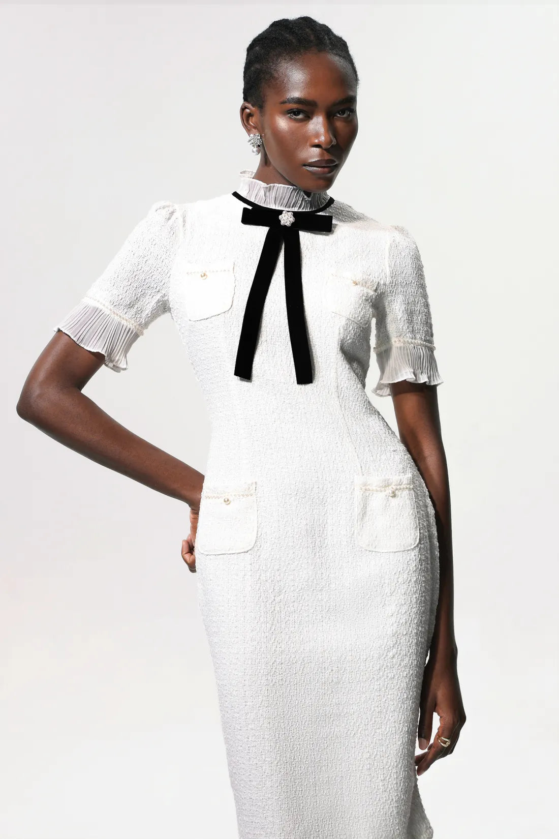 Vedasa Fiyonk İnci Düğmeli Tweed Midi Elbise