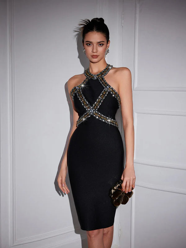 Halter Yaka Taşlı Bandaj Midi Elbise