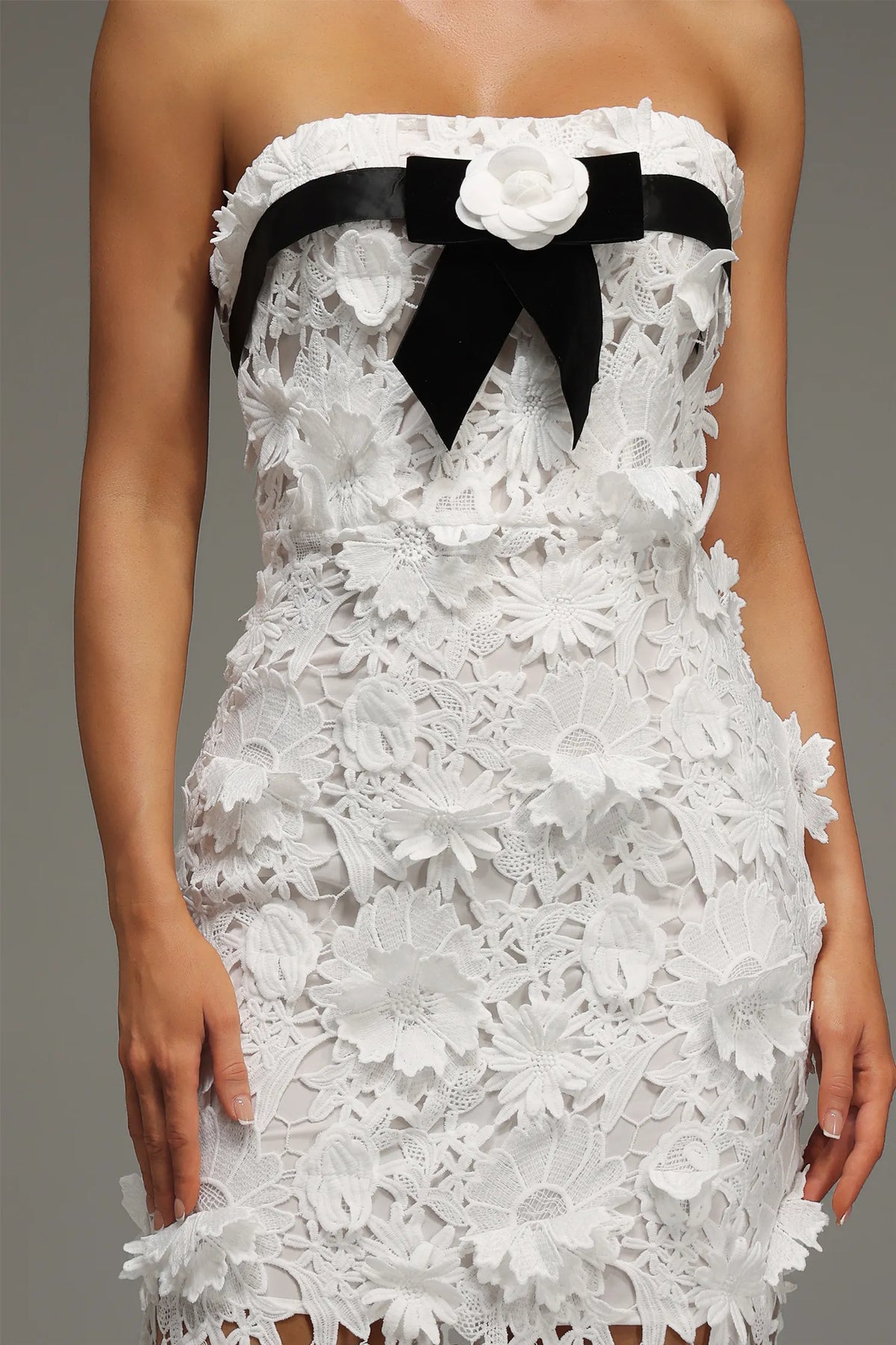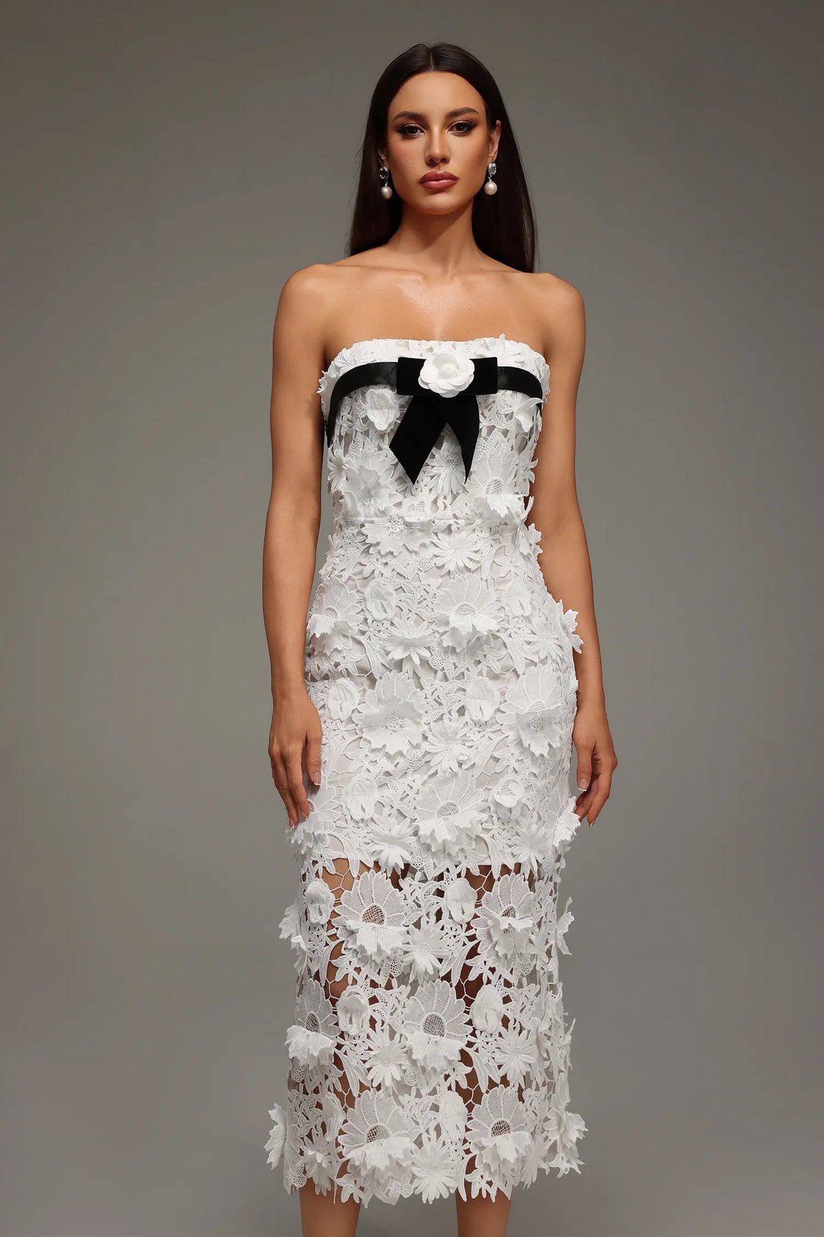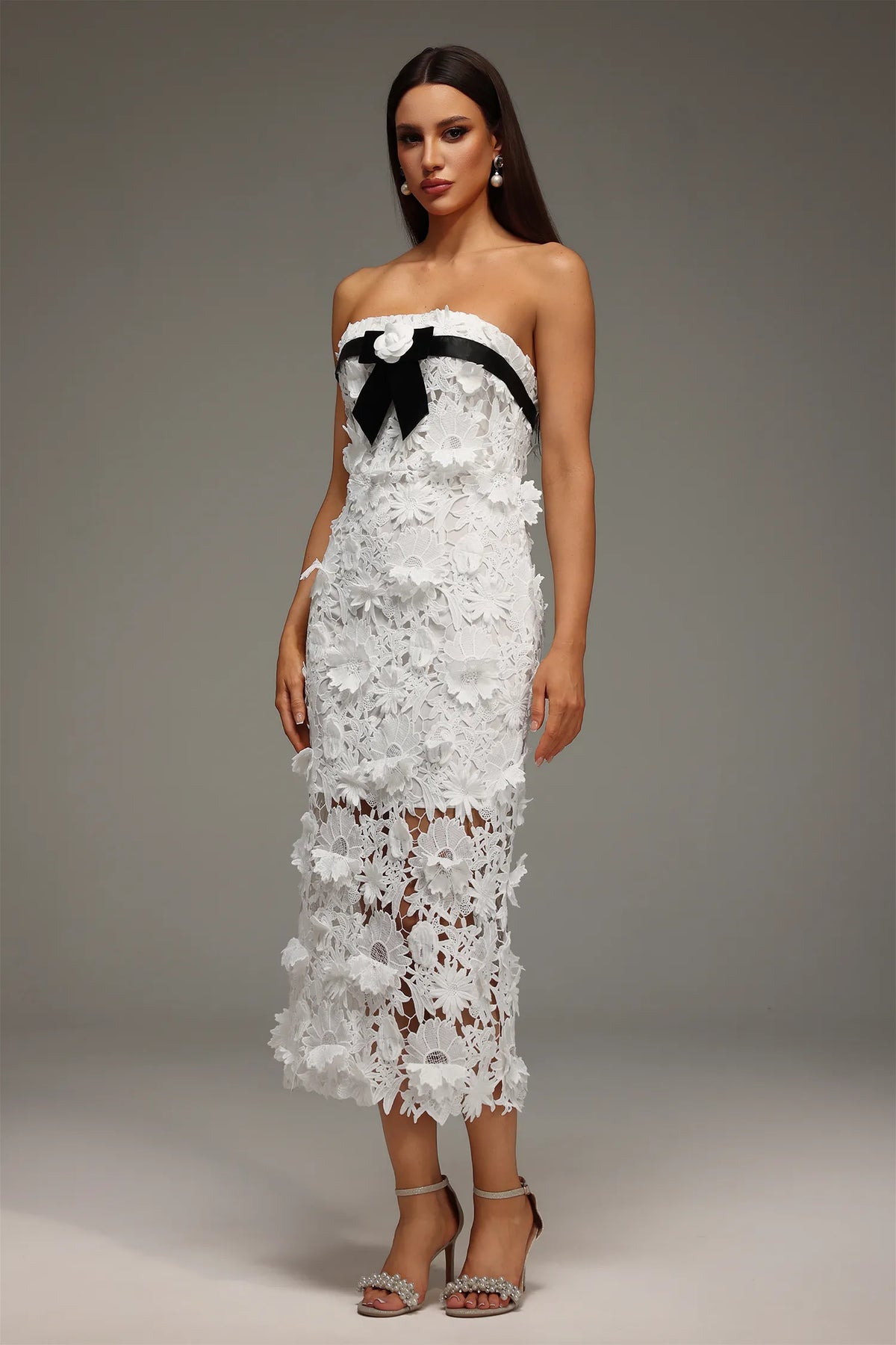 Mio Straplez Dantel Çiçekli Uzun Elbise